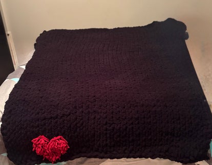 Twin size all black hand knitted blanket with red heart.